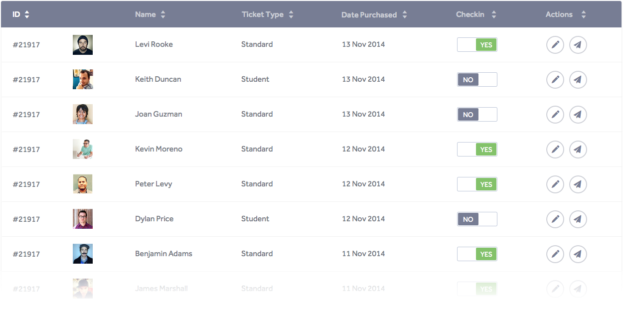 View detailed information on your attendees, including the ticket they’ve purchased and when they purchased it.