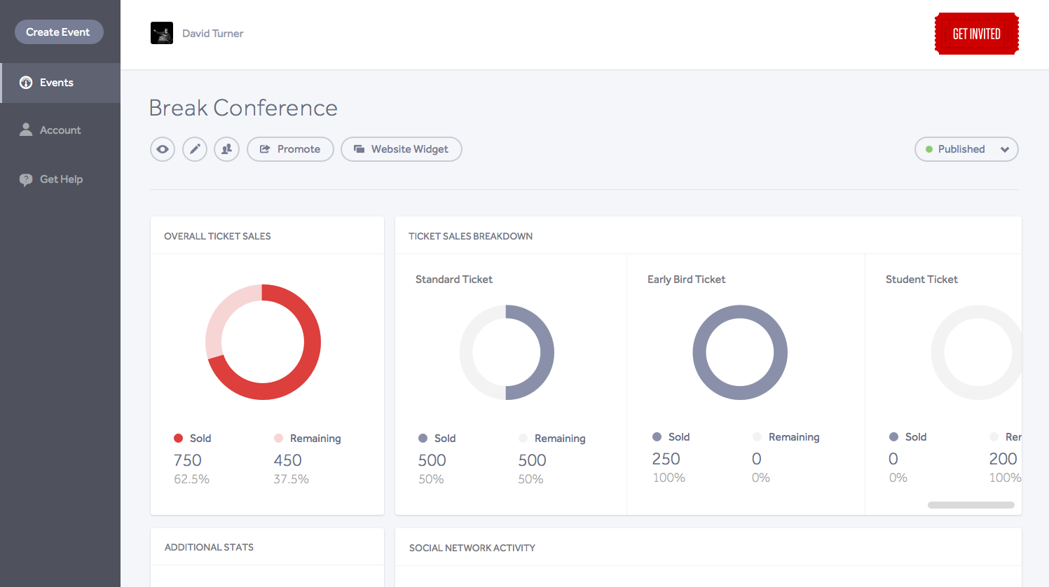 Learn MoreTrack the progress of your event at any time – see how many tickets you’ve sold and how many people have engaged with your event on Facebook or Twitter.