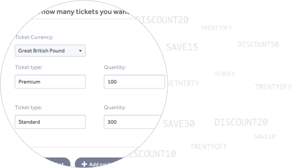 Set your own ticket categories, prices and quantities. You can create as many categories as you like. Need discount codes? No problem. Set discounts for promotions easily, and encourage more sign-ups.